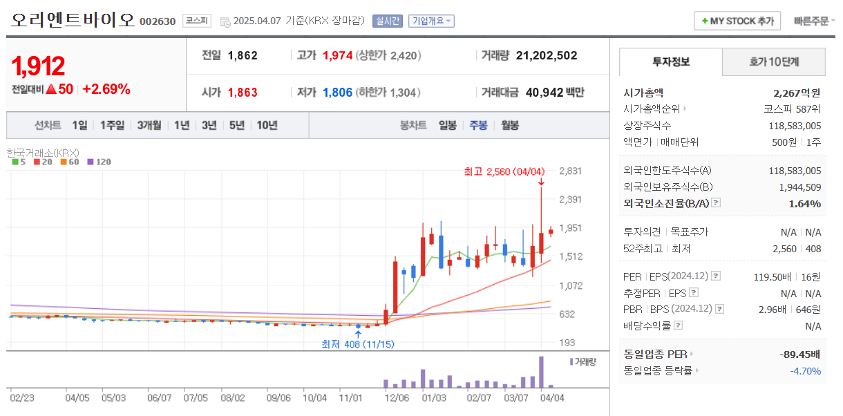 오리엔트바이오는 오리엔트정공과 함께 이재명 테마주로 분류되며, 최근 주가 상승을 보였습니다. 2025년 4월 7일 기준 주가는 전일 대비 2.85% 상승한 1,915원을 기록하였습니다. ​