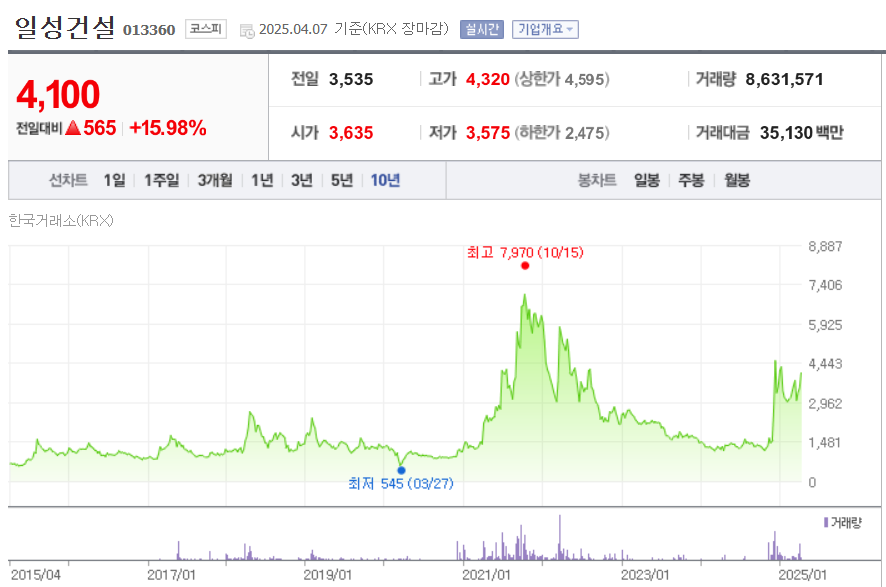 일성건설은 성남시 소재 건설사로, 이재명 대표의 성남시장 재임 시절과의 연관성으로 인해 관련주로 주목받습니다. 2025년 4월 7일 기준 주가는 전일 대비 15.98% 상승한 4,100원을 기록하였습니다.