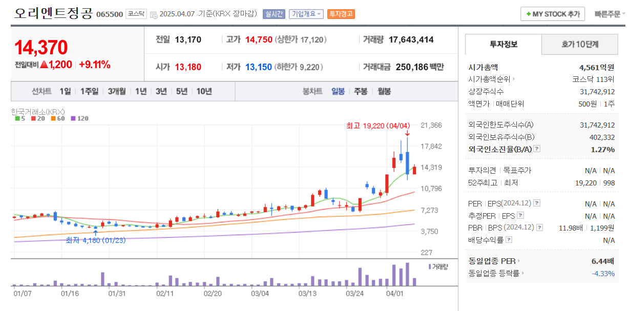 오리엔트바이오는 오리엔트정공과 함께 이재명 테마주로 분류되며, 최근 주가 상승을 보였습니다. 2025년 4월 7일 기준 주가는 전일 대비 2.85% 상승한 1,915원을 기록하였습니다.