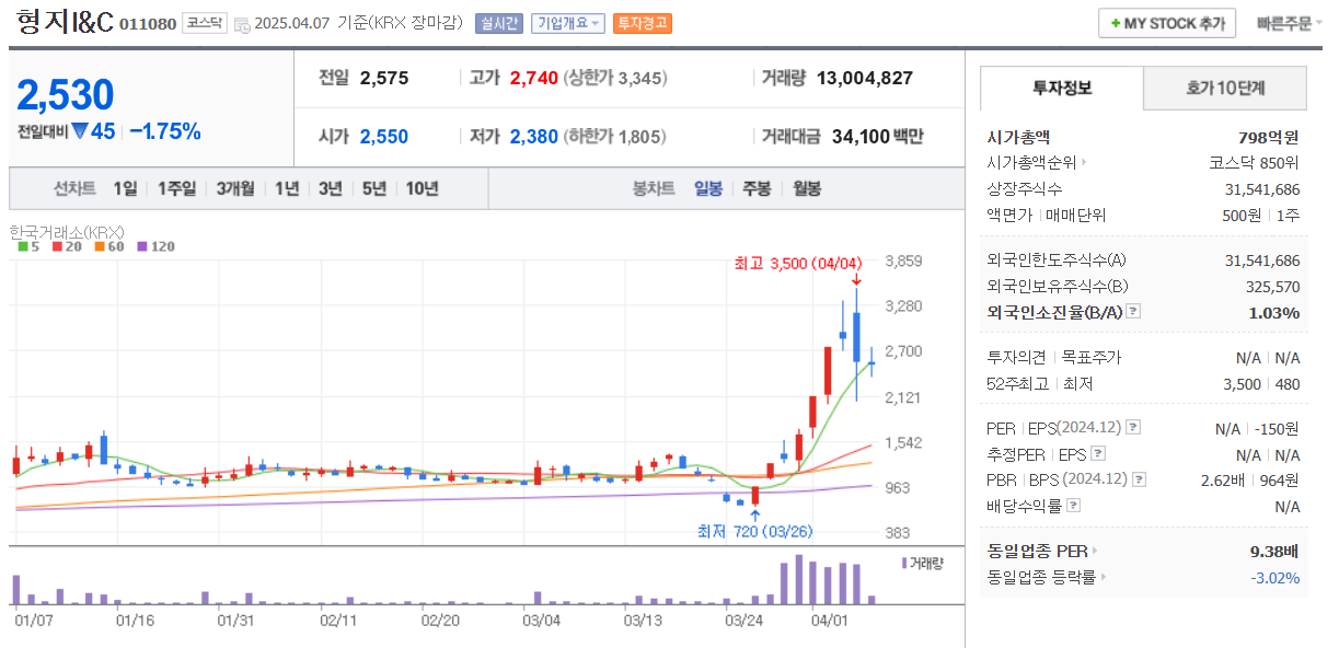 형지I&C는 이재명 대표와의 연관성으로 인해 관련주로 부각되었습니다. 2025년 4월 7일 기준 주가는 전일 대비 1.36% 상승한 2,610원을 기록하였습니다.